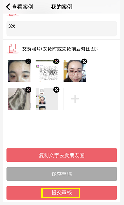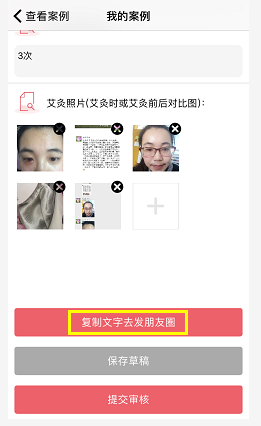 2. 回到APP填写案例页面→添加艾灸时的照片(有艾灸前后对比图更好)、朋友圈截图→提交审核